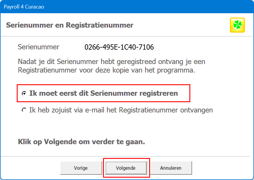 6. Selecteer de optie "Ik moet eerst dit Serienummer registreren" en klik op "Volgende".